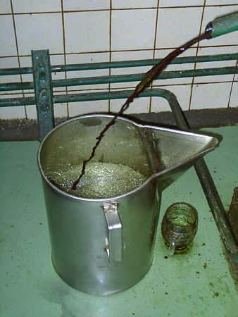 So fließt es aus der Mühle in die Kanne - und dann geht es ab in die Flasche.